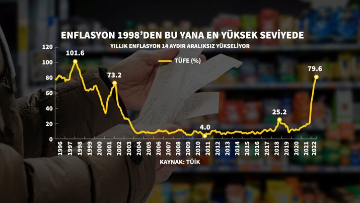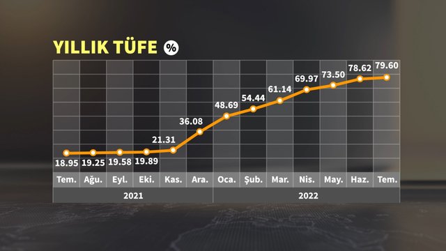 Türkiyədə illik inflyasiya 79,6 faiz; aylıq inflyasiya 2,37 faiz təşkil edib. Məlumatlar göstərir ki, ölkədə illik inflyasiya ardıcıl 14-cü aydır artır.Türkiyə Statistika Təşkilatı (TÜİK) iyul ayı üzrə istehlakçı və istehsalçı qiymətləri indekslərini açıqlayıb.