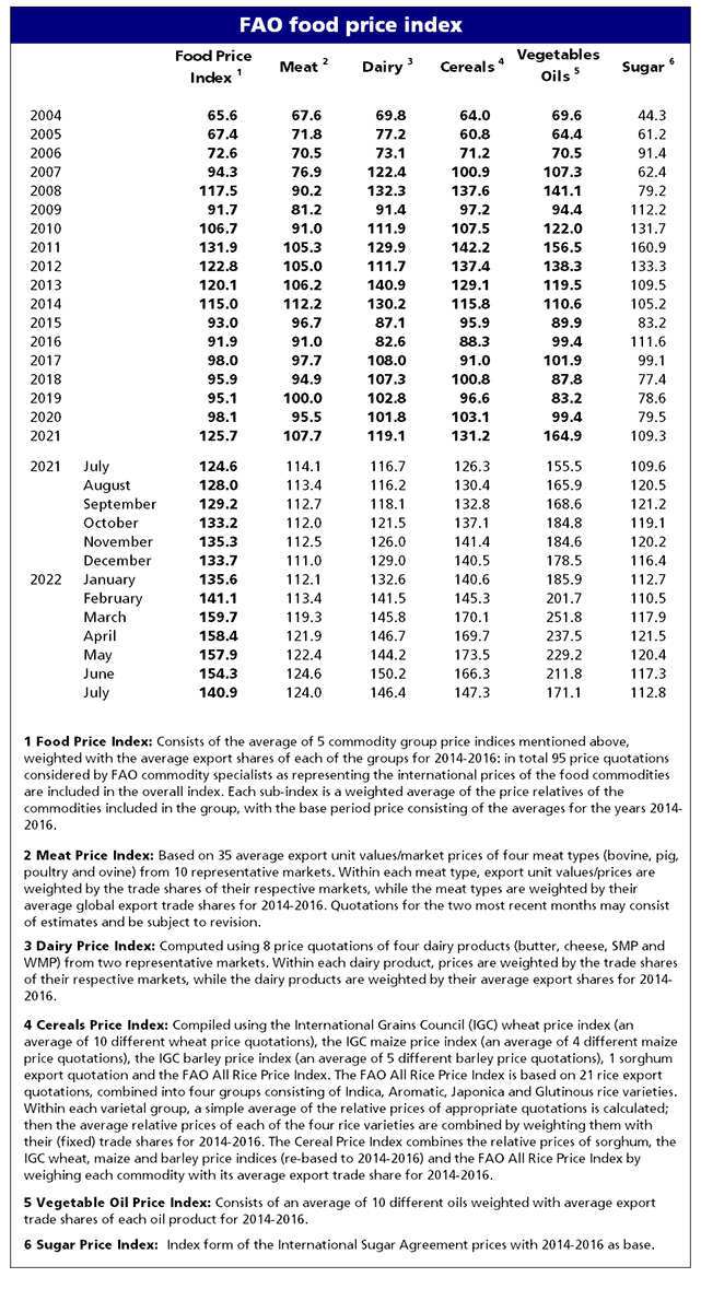 FAO-nun Taxıl Qiymətləri İndeksi aylıq müqayisədə 11,5 faiz azalaraq iyul ayında orta hesabla 147,3 bənd təşkil edib. İllik müqayisədə16,6% artım var. Dünya buğda qiymətləri qismən Ukraynanın Qara dənizdəki əsas limanlarını blokdan çıxarmaq və Ukraynadan taxıl ixracını bərpa etmək üçün Ukrayna ilə Rusiya arasında razılaşmanın imzalanması ilə iyul ayında 14,5 faizə qədər ucuzlaşıb. Şimal yarımkürəsində məhsulun mövsümə uyğunluğu da qiymətlərin geri çəkilməsində təsir edib. Bununla belə, beynəlxalq buğda qiymətləri hələ də keçən ilin iyul ayı dəyərlərindən 24,8 faiz yüksəkdir.