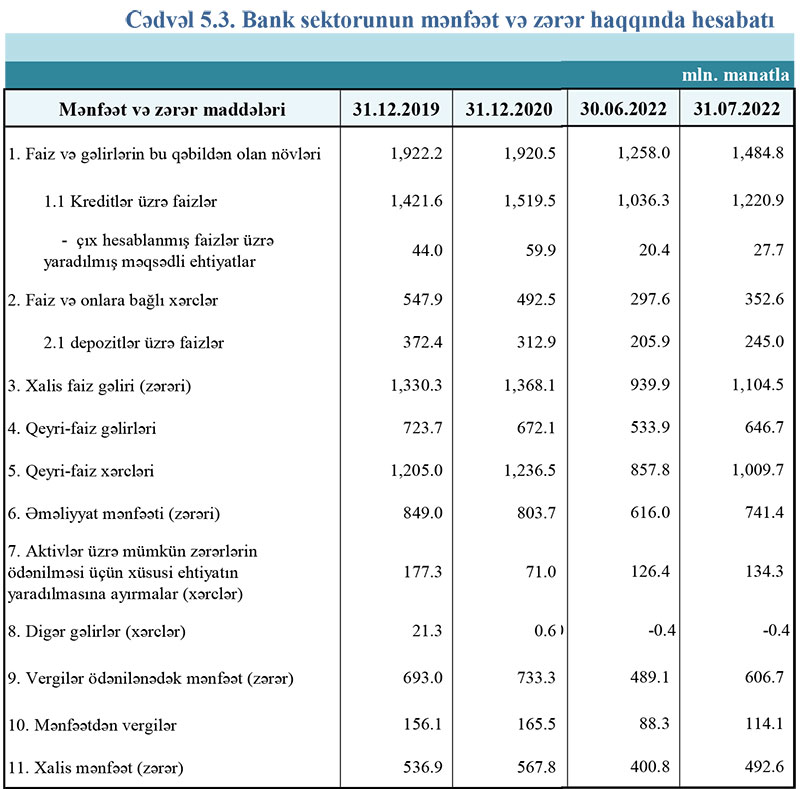 2021-ci ilin 7 ayında bankların cəmi faiz gəlirləri 1 milyard 184.6 milyon manat ikən, 2022-ci ilin 7 ayında 1 milyard 484.8 milyon manat təşkil edib. Bankların qeyri-faiz gəlirləri isə 487.9 milyon manatdan 646.7 milyon manata yüksəlib.