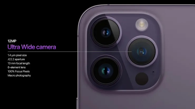 48 meqapiksellik əsas kameraya malik iPhone 14 Pro modelləri iPhone 13 Pro modellərindən 2 dəfə az işıqda fotoşəkil çəkə biləcək. iPhone 14 Pro modellərinə 12 MP telefoto və 12 MP ultra geniş bucaqlı kamera da daxildir.