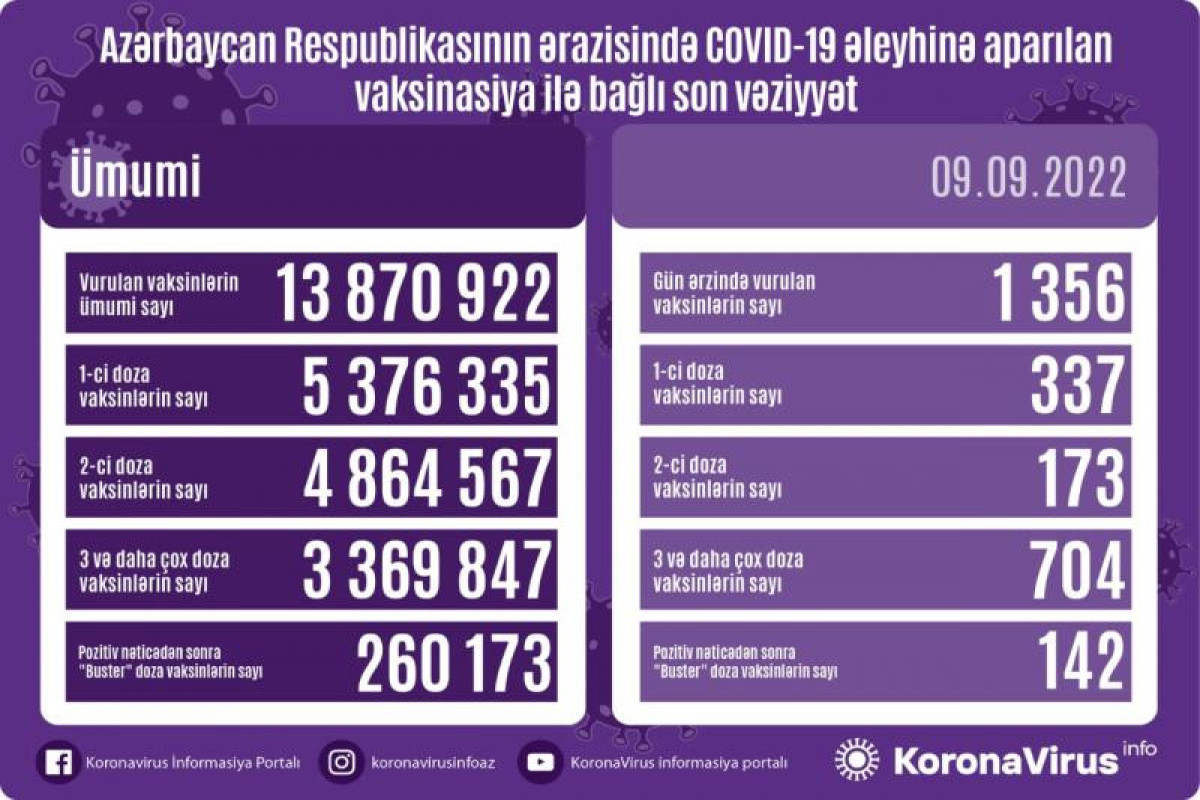Azərbaycanda son sutkada koronavirus (COVID-19) əleyhinə 1356 vaksin vurulub. Bir gündə birinci mərhələ üzrə vaksinasiya olunanların sayı 337, ikinci mərhələ üzrə vaksinasiya olunanların sayı 173, üç və daha çox doza üzrə vaksinasiya olunanların sayı 704, pozitiv nəticədən sonra buster doza üzrə vaksinasiya olunanların sayı 142 nəfərdir.