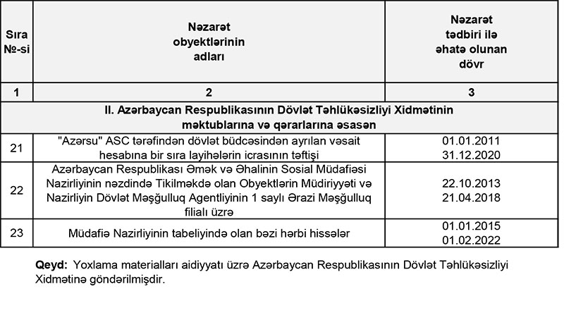 Bununla yanaşı, Xidmət tərəfindən dövlət orqanlarına daxil olmuş vətəndaş müraciətlərinə əsasən 3 təşkilatda müraciətdə göstərilənlər yoxlanılmış, cəmi 64,4 min manat məbləğində artıq və əsassız ödənişlərə yol verildiyi aşkar olunmuş və yoxlamalarla aşkar edilmiş nöqsanlara hüquqi qiymət verilməsi üçün yoxlamaların nəticələri üzrə tərtib edilmiş sənədlər Azərbaycan Respublikasının Baş Prokurorluğuna göndərilmişdir.