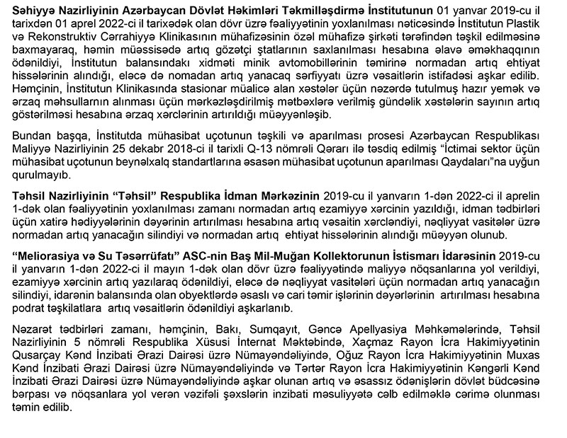 52 təşkilatda yoxlama aparılıb, 100 milyon manata yaxın artıq və əsassız ödənişlər aşkar edilib