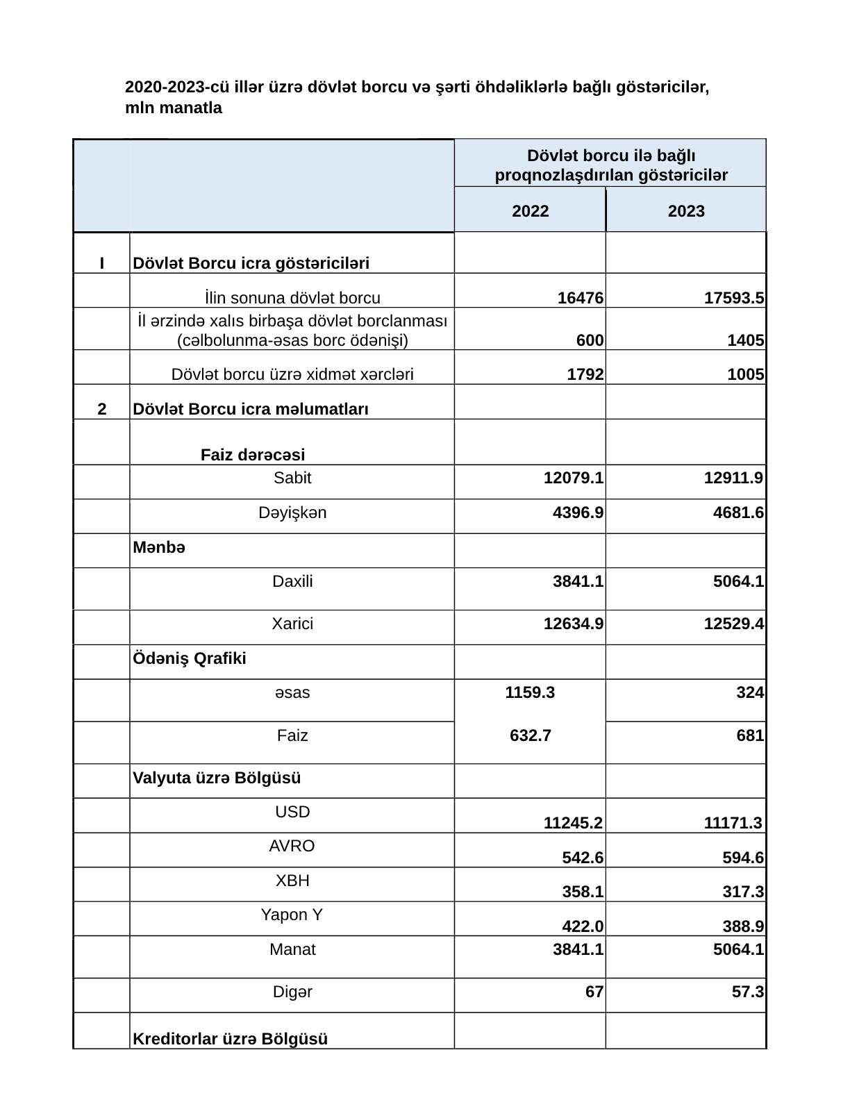 Azərbaycanın dövlət borcunun 2022-ci ilin sonunda 16 milyard 476 milyon manat, 2023-cü ilin sonunda isə 17 milyard 593.5 milyon manat təşkil edəcəyi proqnozlaşdırılır.