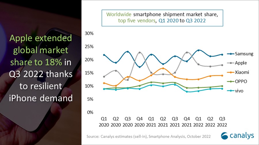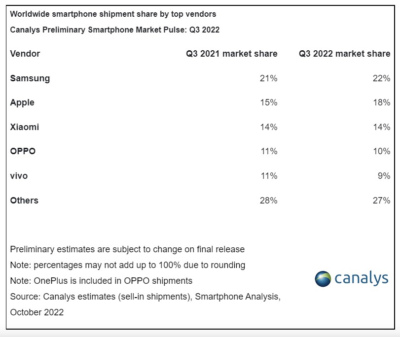 Sentyabr ayında iPhone 14 seriyasını təqdim edən Apple şirkəti bazar payını 18%-dən 18%-ə çatdırıb. Oppo və Vivo isə keçən illə müqayisədə daha kiçik paya malik olublar. Oppo-nun bazar payı 11%-dən 10%-ə, Vivo-nun bazar payı isə 11%-dən 9%-ə düşüb.