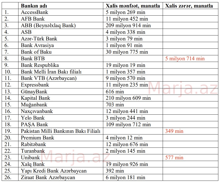 23 bank mənfəət, 3 bank zərər açıqladı - SİYAHI
