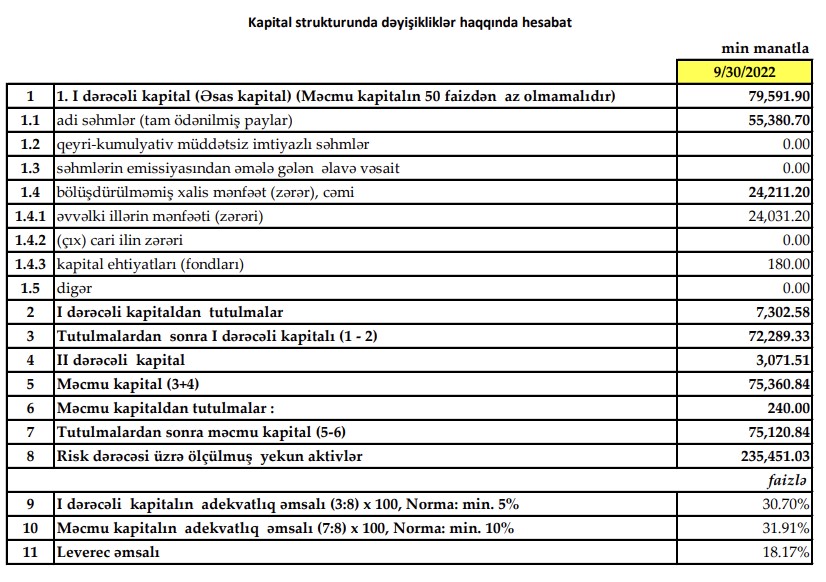 30 Sentyabr 2022-ci il tarixində “Yapı Kredi Bank Azərbaycan” 75 milyon 120 min manat məcmu kapitala malik olub. Bank ötən ilin sonunda 74 milyon 316 min manat məcmu kapitala malik idi. Bankın I dərəcəli kapitalın adekvatlıq əmsalı 30.70% (norma 5%), məcmu kapitalın adekvatlıq əmsalı 31.91% (norma 10%) və leverec əmsalı 18.17% təşkil edib.