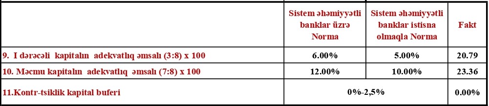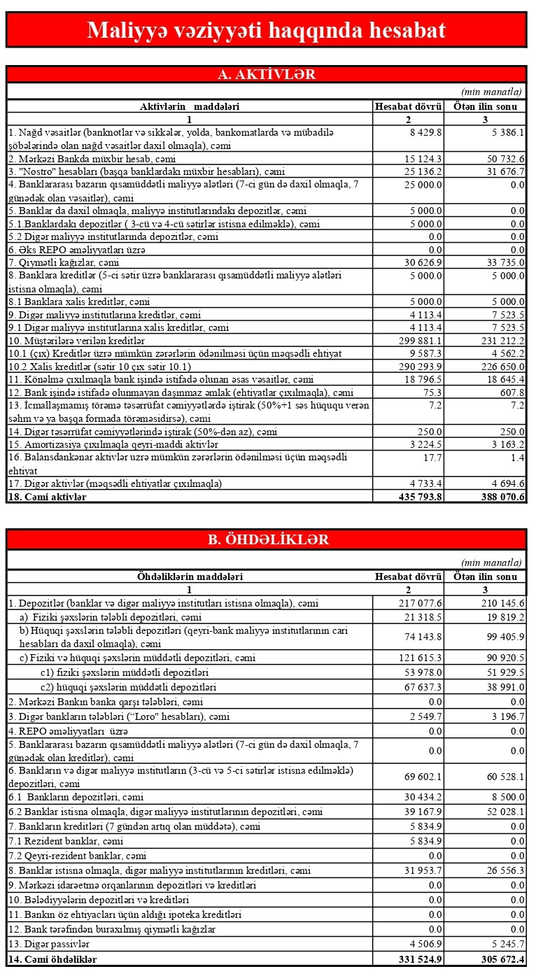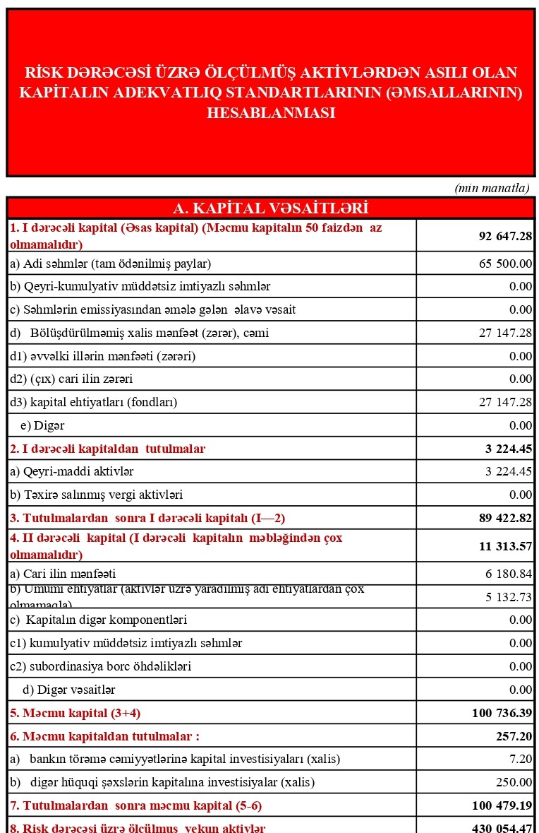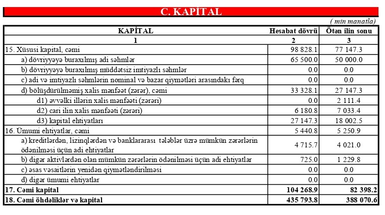 Bankın cəmi aktivləri də ilin sonundan bu günədək 12.3% artaraq 436 mln manata çatmışdır. Bankın cəmi kapitalı isə ötən ilin sonundan 27% artaraq 104 mln manatı keçmişdir.