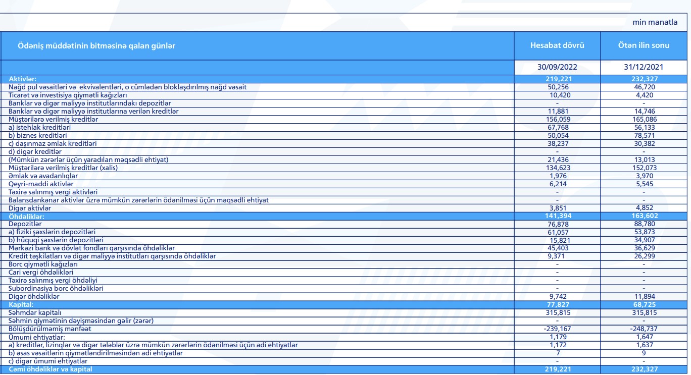 Sentyabrın sonuna bankın kredit portfeli 156.1 milyon manat, depozit portfeli – 76.9 milyon manat təşkil edib. Onu da qeyd edək ki, fiziki şəxslərin əmanətləri ilin əvvəlindən 13.3% artıb.