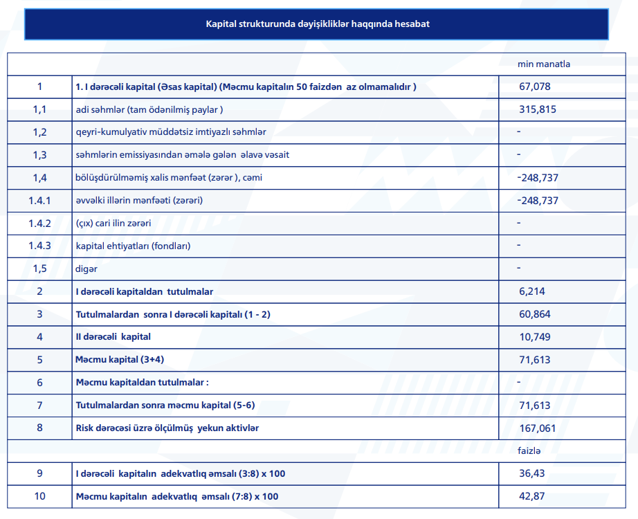 Bankın məcmu kapitalı ilin əvvəlindən 13.2% artaraq 77.8 milyon manat təşkil edib.