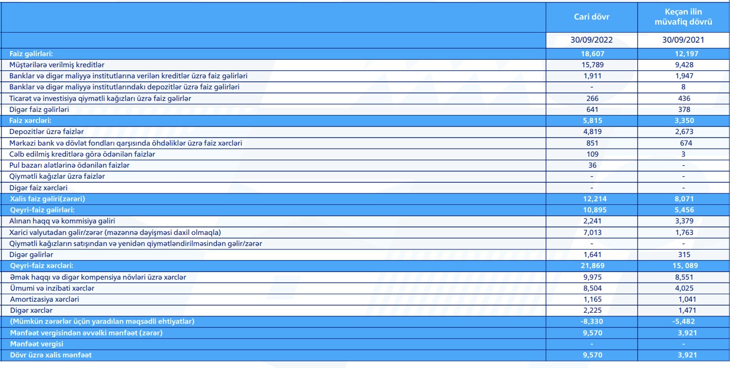 Bankın yaydığı press-relizdə bildirilir ki, 30 sentyabr 2022-ci il tarixinə bankın əməliyyat gəlirləri 29.5 milyon manat, o cümlədən faiz gəlirləri – 18.6 milyon manat, qeyri-faiz gəlirləri – 10.9 milyon manat təşkil edib. Ötən ilin müvafiq dövrü ilə müqayisədə bankın faiz gəlirləri 52.6%, qeyri-faiz gəlirləri isə 2 dəfə artıb.