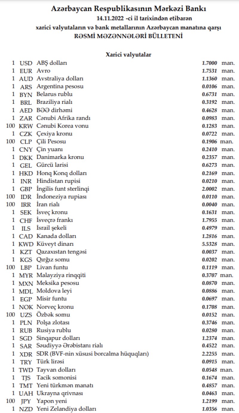 Rəsmi məzənnələr açıqlandı