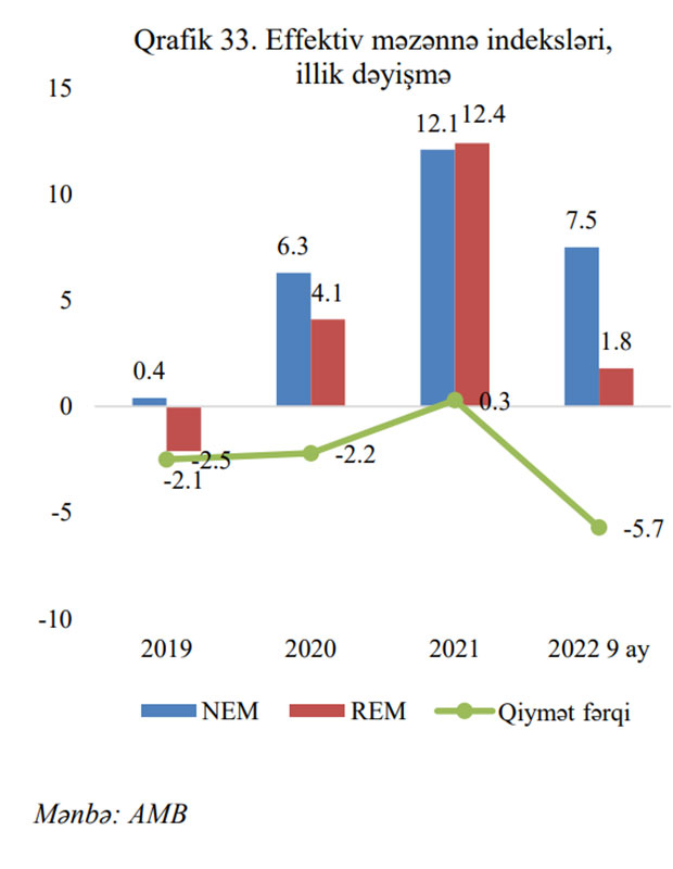 Qeyd edilib ki, Azərbaycandakı inflyasiyanın tərəfdaş ölkələrdəki orta inflyasiyadan aşağı olması real effektiv məzənnəyə azaldıcı təsir etmişdir.
