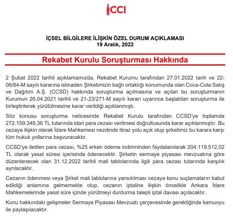 Türkiyənin Rəqabət Qurumu "Coca-Cola İçecek" (CCI) şirkətinin törəmə şirkəti "Coca-Cola Satış və Dağıtım A.Ş"yə 272,2 milyon türk lirəsi (təxminən 25 milyon manat) cərimə tətbiq etdiyini açıqlayıb.