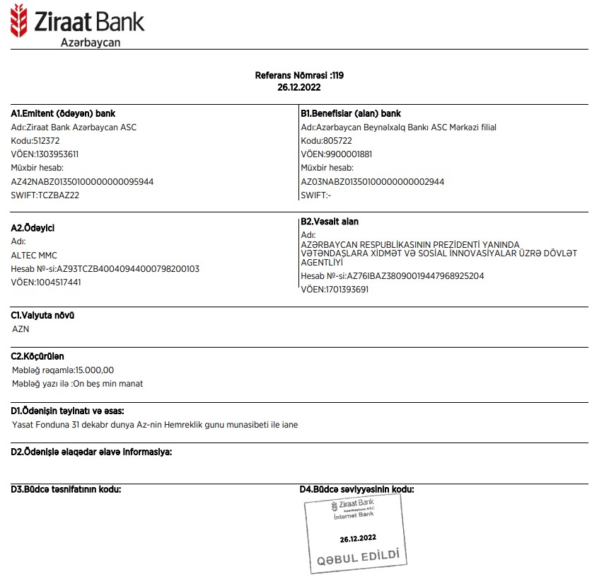 “ALTEC” aluminium zavodu “YAŞAT” fonduna ianə etdi - MƏBLƏĞ