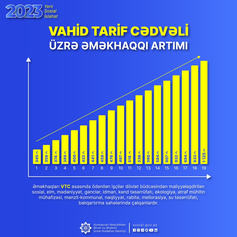 Azərbaycan Respublikası Prezidentinin Sərəncamına əsasən minimum aylıq əməkhaqqının 1 yanvar 2023-cü ildən 345 manata çatdırılması ilə əlaqədar Nazirlər Kabineti dövlət büdcəsindən maliyyələşdirilən sahələrdə işləyənlərin tarif (vəzifə) maaşlarının da bu Sərəncama uyğunlaşdırılması üçün həmin işçilərin əməyinin ödənilməsinin yeni Vahid Tarif Cədvəlini təsdiq edib.