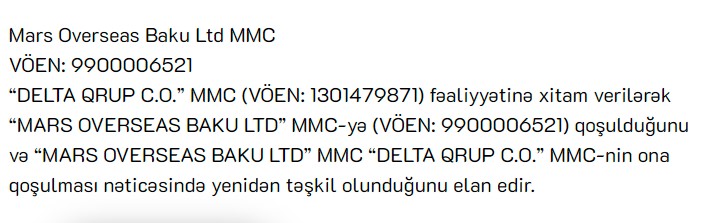 “DELTA QRUP C.O.” MMC fəaliyyətinə xitam verilərək “MARS OVERSEAS BAKU LTD” MMC-yə qoşulduğunu və “MARS OVERSEAS BAKU LTD” MMC “DELTA QRUP C.O.” MMC-nin ona qoşulması nəticəsində yenidən təşkil olunduğunu elan edir", -"Mars Overseas Baku Ltd" MMC-nin məlumatında bildirilir.