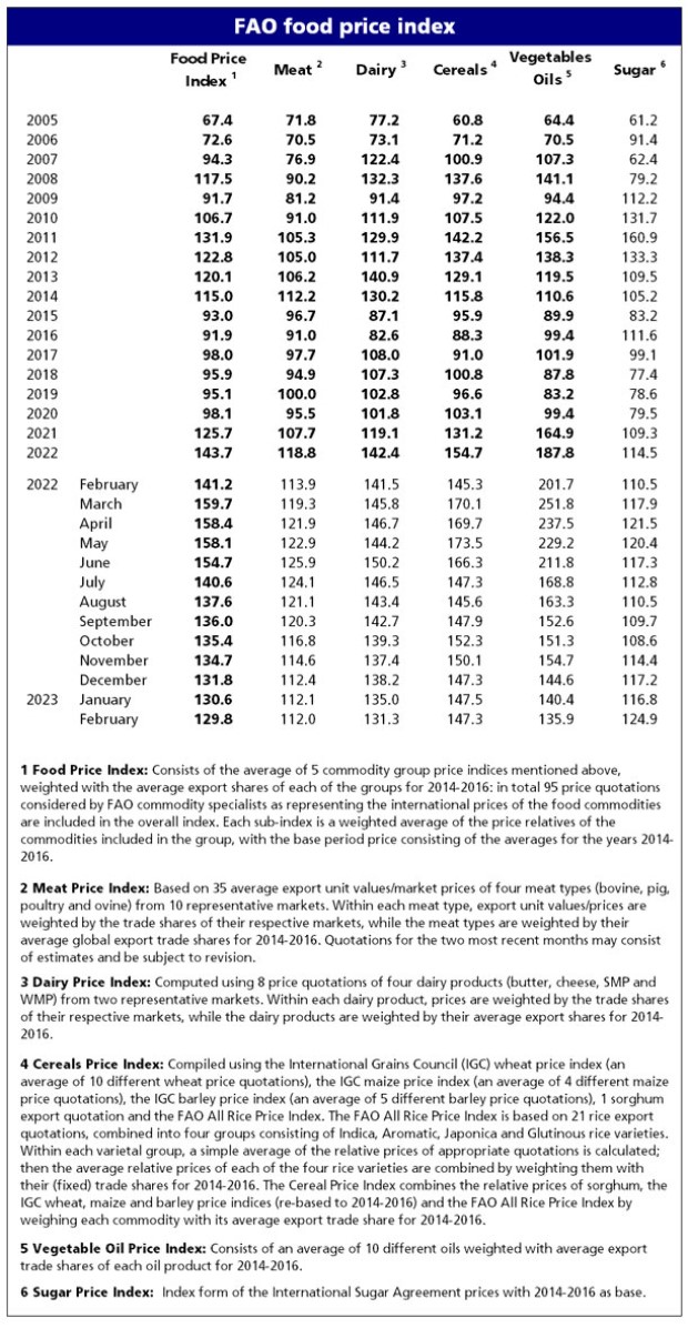 Marja xəbər verir ki, FAO-nun Ərzaq Qiymətləri İndeksi fevral ayında yanvar ayına nisbətən 0,6 faiz azalaraq orta hesabla 129,8 bənd təşkil edib. İndeks illik müqayisədə (2022-ci ilin favral ayı ilə müqayisədə) 8,1 faiz geriləyib.